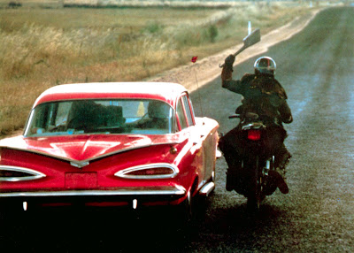 But I’m going to focus on the Fonz portion of the show, since that one deals with the future. First off, the premise is that Fonz, Ritchie, Ralph Malph (and Fonzie’s dog Mr. Cool) join a future chick named Cupcake and ride in her spaceship, which is also a time-machine. We know this is true to the Happy Days universe, because in the fifth season (post-shark-jump) Mork from Ork visited the Fonz. So we know that aliens and UFOs were around in 1957 Milwaulkie, and they were capable of traveling into the future and Boulder Colorado.) [Also, I wonder if this is where Repo Man took the idea that flying saucers are time machines?]