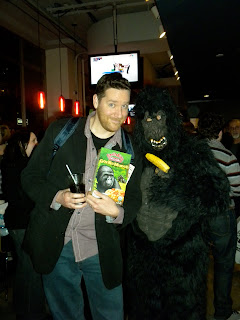 After 22 shows, great reviews and sold-out houses, Kevin Maher (pictured, with gorilla) is stopping the run following this Friday’s event (Kevin Geeks Out About Aliens ). Since January 2008 Kevin produced the monthly “pop culture cavalcade”, covering favorite genre topics like Bigfoot , Batman, Dummy Deaths, Visions of the Future and Shark Cinema.